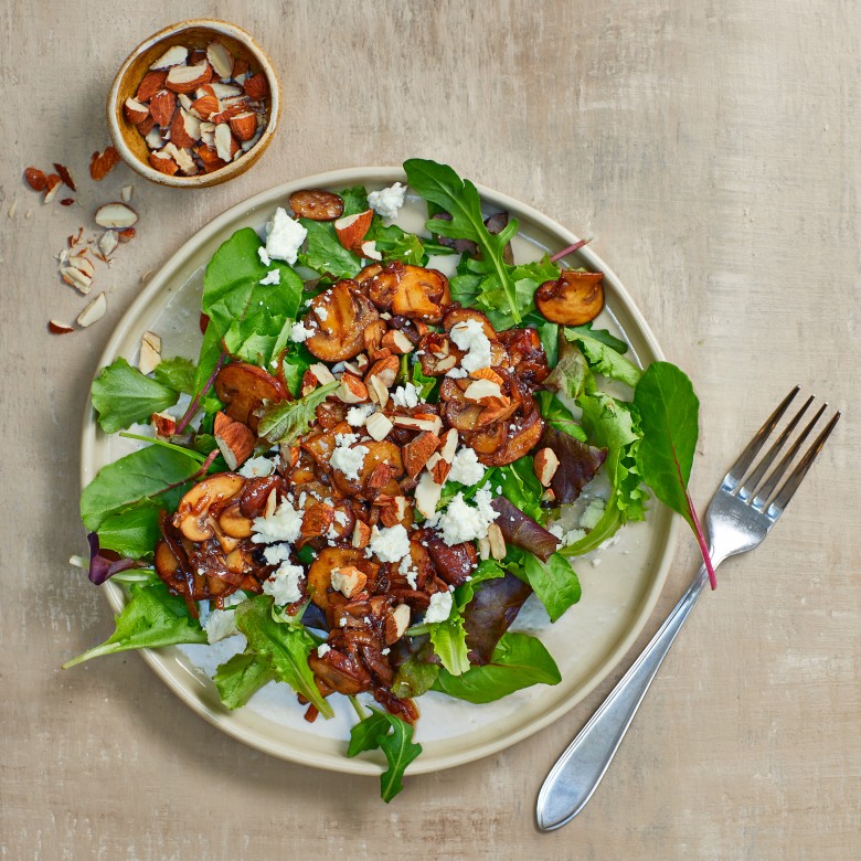 Verdeel de sla over borden. Schep de champignons en dressing erop. Verdeel de geitenkaas erover en bestrooi met de amandelen.
